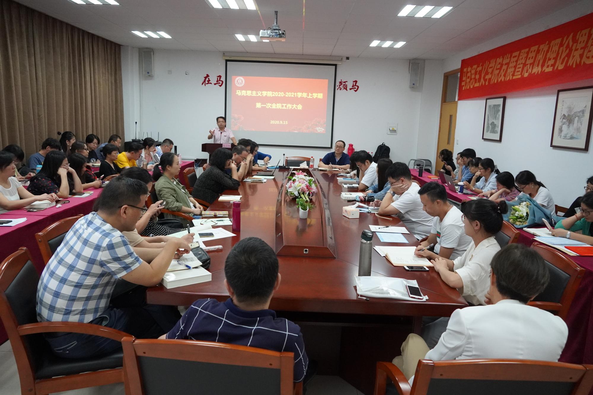 6位教研室主任分别介绍各自教研室的工作思路和重点。马克思主义基本原理教研室主任韩跃民老师介绍本教研室在新学期的工作规划。在教学工作方面,马院教研室以教学改革为核心目标,教学内容不仅突出经典文献的品读,还要与浙江省发展实践相结合,同时设置习近平总书记关于浙江重要讲话的一系列资料;在日常工作方面,推动线上、线下相结合的集体备课会和青年教师的帮扶计划。中国近现代史纲要教研室主任高伟老师介绍了新学期纲要课教学计划的调整和教学大纲的修编,介绍了本教研室对青年教师的帮扶计划,同时还介绍了纲要教研室与其他兄弟教研室互帮互助护持的教学科研计划,努力促成教学、科研团队的形成。中国特色社会主义理论体系概论教研室主任潘旦老师从教学、科研、团建的角度分别介绍了本教研室新学期工作计划。在教学工作的规划中,要积极申报各类课程、积极开展集体备课、努力推进教改工作;在科研工作的规划中,要努力推进国家课题申报研讨会,积极举办论文指导交流活动;在团建工作的规划中,要积极参加省内调研活动等。思想道德修养与法律基础教研室主任王洪霞老师指出,在新学期工作中,思修教研室要加强教学规范化建设,更加注重教学大纲和考试细则,对每一个教学专题要有更为精准的安排,同时努力推进章节和教学主题相一致,加强教研室常规化交流。心理教研室主任李晓娟老师从本教研室成立的理念、宗旨等角度出发,指出心理教育与心理服务为本教研室的工作核心,同时推动心理咨询室的建立。另外,李晓娟老师还指出,还要积极推动心理教研室与学校学生处的合作,努力开展各项心理辅导、心理讲座,同时将此业务拓展到中小学,以及与治疗如自闭症、孤独症等慈善医疗机构合作,做一些公益性的工作。形势与政策教研室主任赵春珍老师从形策课的特殊性出发,指出新学期要大力抓好常规化教学,搞好两次集体备课,组织好两次示范课建设,狠抓学生考勤考核;还要全力做好本教研室科研、教改工作,多贡献教学新智慧,同步慕课资料;另外还要组织教研室成员共同撰写教研论文,多组织多开展教研室怡情怡心的教研活动。