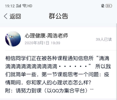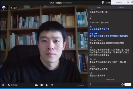 对于周浩老师来说,新学期第一堂课虽然隔着屏幕,但同学们依然按时到课并积极参与讨论。在围绕“疫情期间心理状态“的主题分享中,大家一起深入浅出地学习了应激反应、代际差异、情绪耗竭等概念,整体气氛轻松愉快。周浩老师表示,接下来网络授课的教学内容会适当掌控教学进度,形成在线教学流程上学生自学环节与教师授课环节间的知识结合,同时将重心放在教学设计、课堂组织上,按照自己的想法,利用自身已有的专业知识,实施更为有利的教学方法与教学手段,在展现了教师个人风格的同时,让教学效果也得到充分保障。