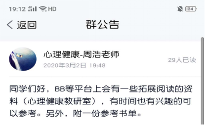 为了增加同学们的积极体验,增强同学们的情感共鸣,强化每一个人对“全国人民幸福共同体”的群体认同,心理课程中适度增加了最富有艺术感染力的音乐元素,例如一首纯音乐歌曲《光》的分享。另外,旨在延展同学们对于课程内容的认知边界,进一步巩固线上教学“全科视角”的教育效果,同时做好防疫“第二战线”上的政策解读、舆论引导、心理疏导等思想政治工作,一份详尽的书单提供了较为全面且专业的能力提升通道,包括全国卫健委组织编制的《新型冠状病毒感染的肺炎公众心理自助与疏导指南》、中国心理学会推荐的读物《人生学校》、《象与骑象人》、《控制焦虑》、《乌合之众》、《枪炮、病菌与钢铁:人类社会的命运》等。