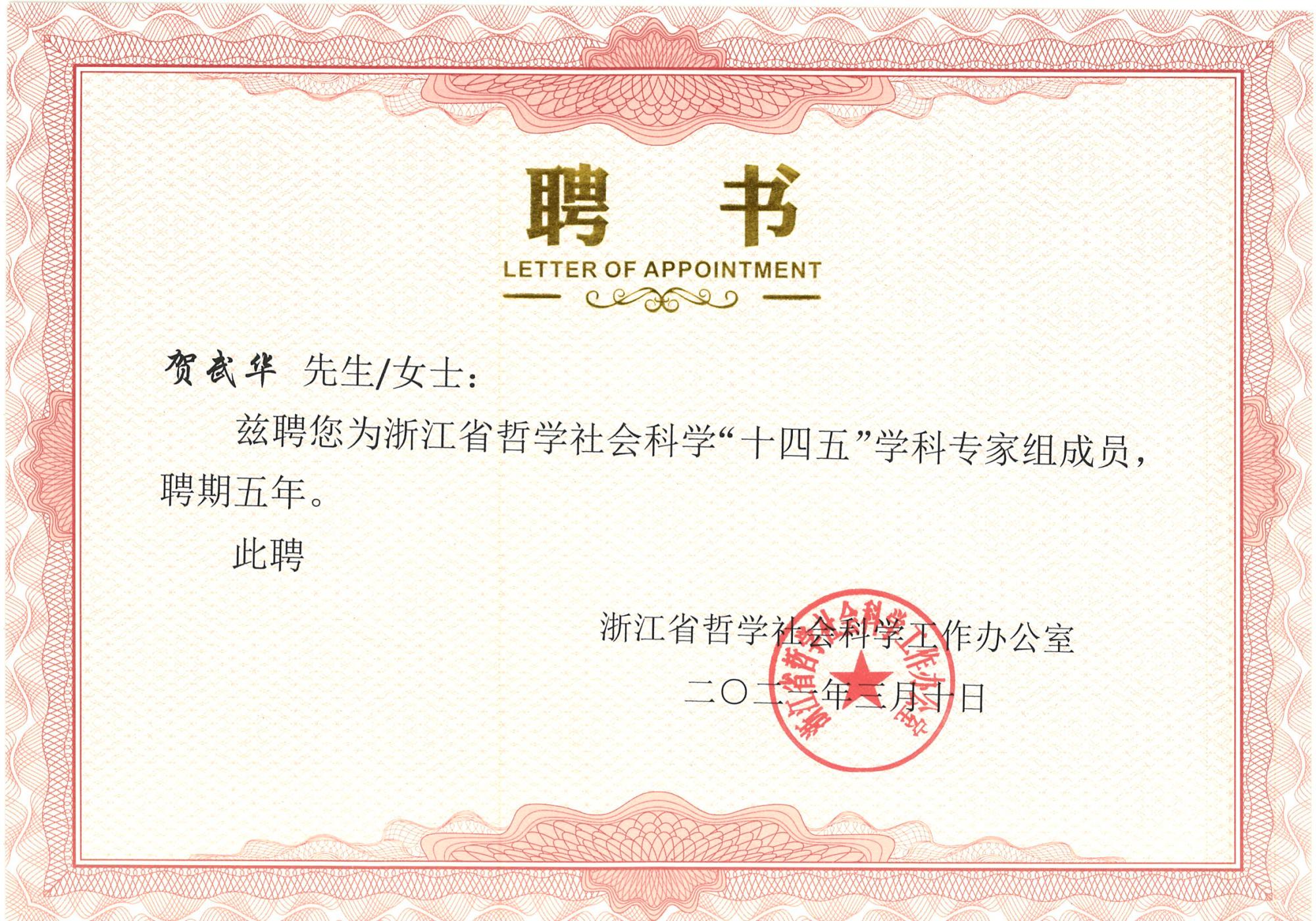 近日,浙江省社会科学发展规划领导小组公布了浙江省哲学社会科学“十四五”学科专家组成员名单。足球比分90 贺武华教授、华正学教授被聘为浙江哲学社会科学“十四五”学科专家组成员,聘期五年。