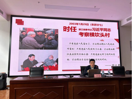 的学生讲了一堂生动的浙江乡村共同富裕课。黄书记讲述2003年习近平总书记曾到横坎头村视察工作时场景,以及习近平总书记给横坎头村的两封回信,希望他们“发扬老区的优良传统,保持艰苦奋斗、自力更生的精神面貌,解放思想,与时俱进,加快老区开发建设,尽快脱贫致富奔小康”。黄书记介绍了20年来,横坎头村在村党委班子的带领下,发扬老区人民艰苦奋斗、苦干实干精神,大力发展“红绿”融合的特色农旅产业,充分挖掘横坎头村历史优势、区位优势,打造浙东红村的历史过程,介绍了乡村产业发展和集体经济取得的成果。横坎头村为革命老区摆脱贫困实现共同富裕探索了一条新路径。