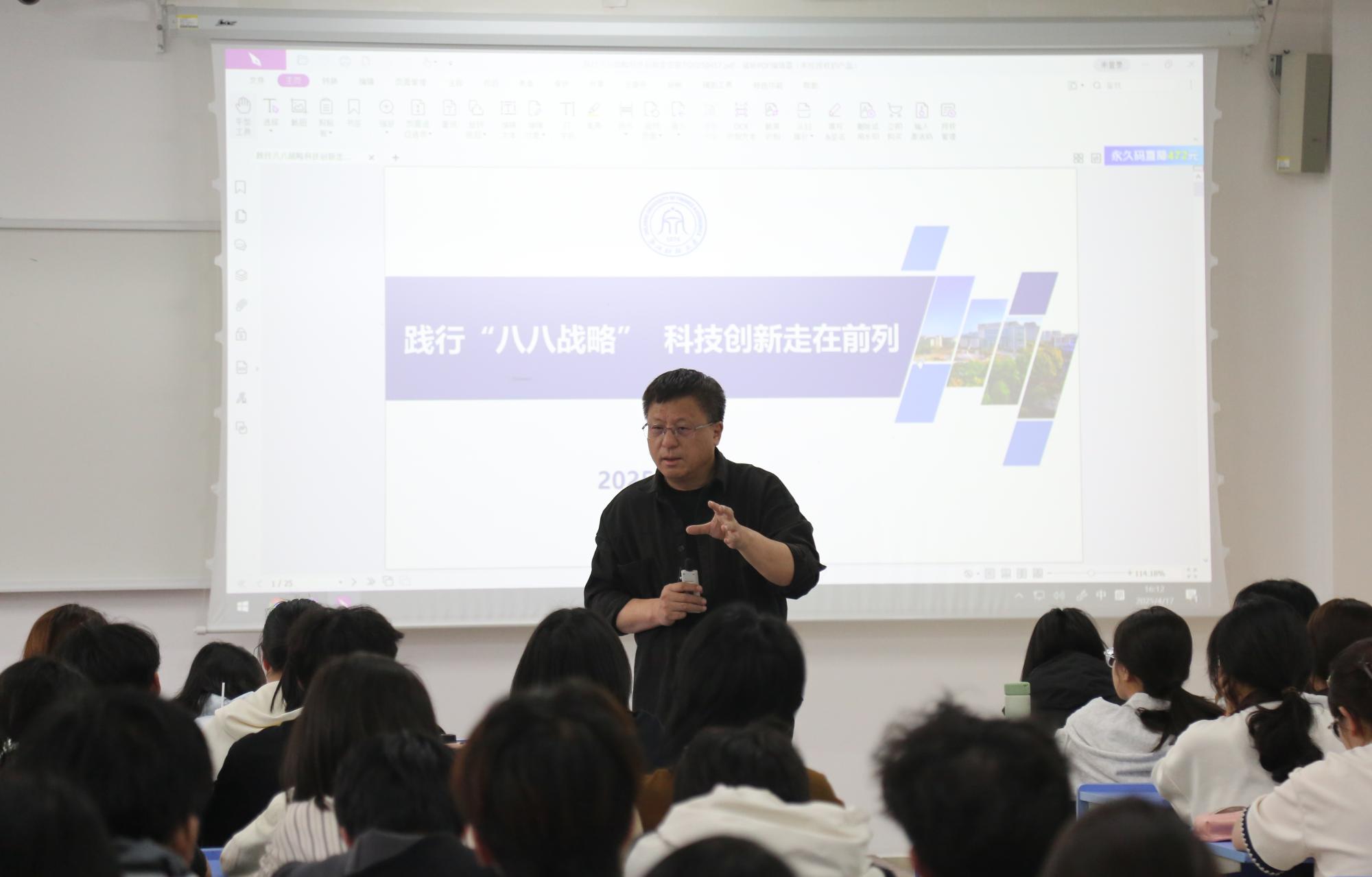 4月17日,魏江校长以“践行“八八战略” 科技创新走在前列”为题,为24级工商管理、规划和美术学专业的近百名同学带来一堂突破学科边界的思政创新课。这场持续一个多小时的课程以独特的“战略解码-现实破题-人生导航”三阶架构,构建了贯通历史纵深与未来图景的教学场域。