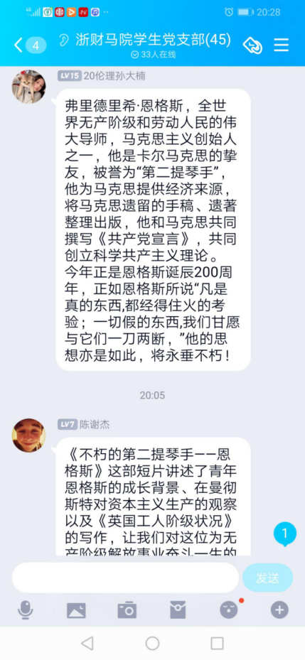 各基层党支部组织开展了纪念恩格斯诞辰200周年纪念主题党日活动,活动由各支部书记主持。党员们首先观看了纪录片《不朽的第二钢琴手恩格斯》的观影活动。影片从恩格斯的家庭背景、在曼彻斯特的生活对《英国工人阶级》的分析等方面了解青年恩格斯的成长轨迹和重要思想来源的基础。