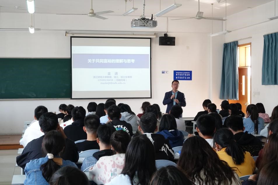 老师们围绕“什么是共同富裕”“为什么要实现共同富裕”“怎样实现共同富裕”三个问题,生动阐释共同富裕的丰富内涵,系统分析共同富裕的重大意义,全面探讨共同富裕的实现路径,深入宣讲浙江省高质量发展建设共同富裕示范区的目标任务和创新性突破性举措。金通用详实的数据和鲜活的浙江案例与现场同学探讨如何通过“做大蛋糕”实现共享富裕,就共同富裕与社会公平、如何构建适合国情的创新体系等问题与学生进行了交流。邵慰与学生探讨了“共同”的主体不仅限于个人之间,还包括区域之间、城市之间以及城乡之间,要解决好、协调好区域之间、城乡之间发展差距问题,为实现共同富裕夯实基础、筑牢根基。贺武华结合马克思主义发展史,厘清了马克思主义总结的实现共同富裕的物质基础、制度要求和实现途径。向鑫、高聪颖、王江红、潘旦、潘菲欧、陈曦、金梦佳等老师结合中国共产党百年历史,梳理了我们党在各个阶段对于实现共同富裕的不懈探索,并激励广大青年学生坚决扛起守好“红色根脉”的时代责任,积极投身共同富裕示范区建设。