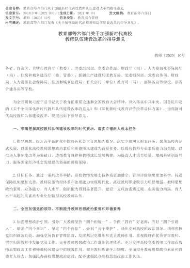 教育部等六部门关于加强新时代高校教师队伍建设改革的指导意见