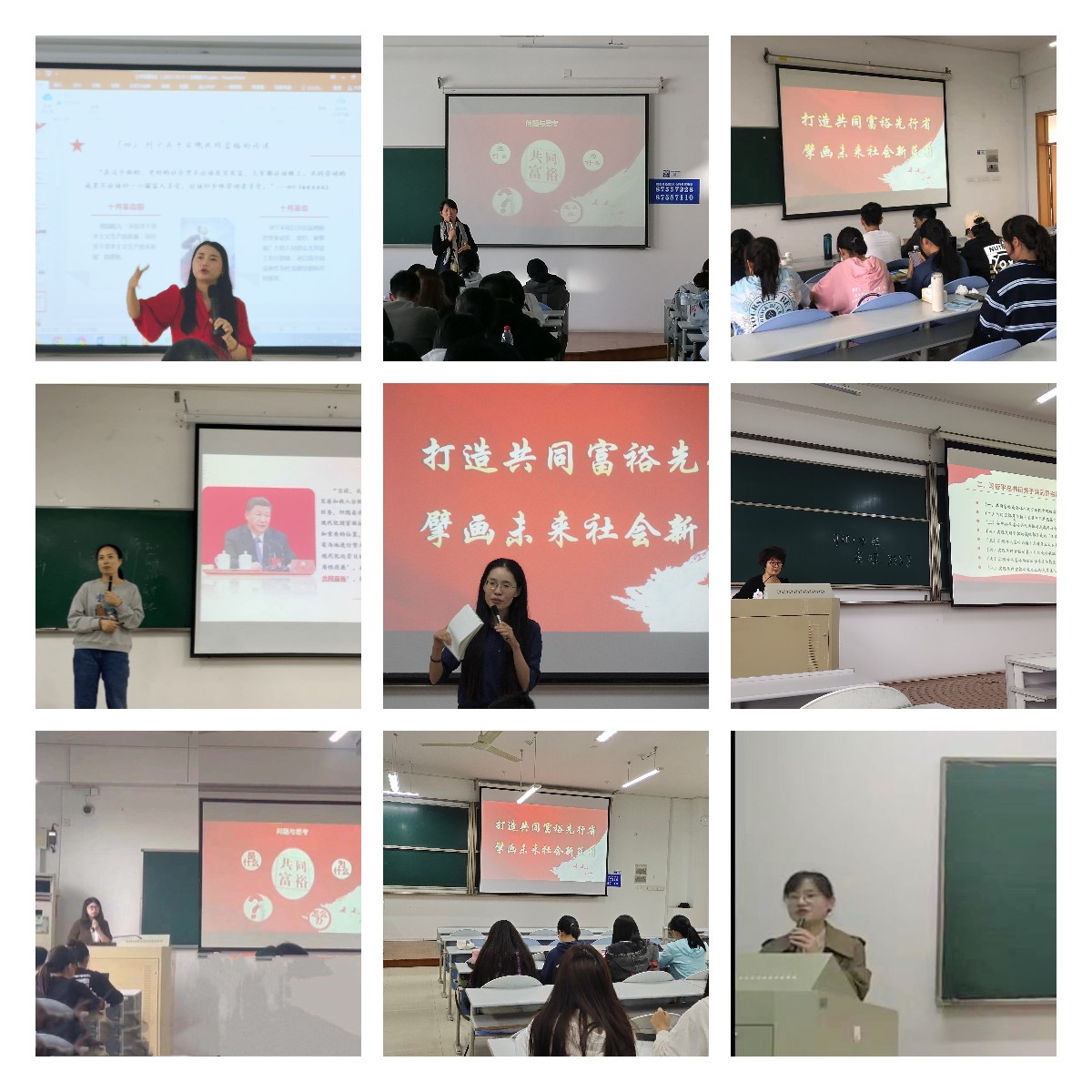 老师们围绕“什么是共同富裕”“为什么要实现共同富裕”“怎样实现共同富裕”三个问题,生动阐释共同富裕的丰富内涵,系统分析共同富裕的重大意义,全面探讨共同富裕的实现路径,深入宣讲浙江省高质量发展建设共同富裕示范区的目标任务和创新性突破性举措。金通用详实的数据和鲜活的浙江案例与现场同学探讨如何通过“做大蛋糕”实现共享富裕,就共同富裕与社会公平、如何构建适合国情的创新体系等问题与学生进行了交流。邵慰与学生探讨了“共同”的主体不仅限于个人之间,还包括区域之间、城市之间以及城乡之间,要解决好、协调好区域之间、城乡之间发展差距问题,为实现共同富裕夯实基础、筑牢根基。贺武华结合马克思主义发展史,厘清了马克思主义总结的实现共同富裕的物质基础、制度要求和实现途径。向鑫、高聪颖、王江红、潘旦、潘菲欧、陈曦、金梦佳等老师结合中国共产党百年历史,梳理了我们党在各个阶段对于实现共同富裕的不懈探索,并激励广大青年学生坚决扛起守好“红色根脉”的时代责任,积极投身共同富裕示范区建设。