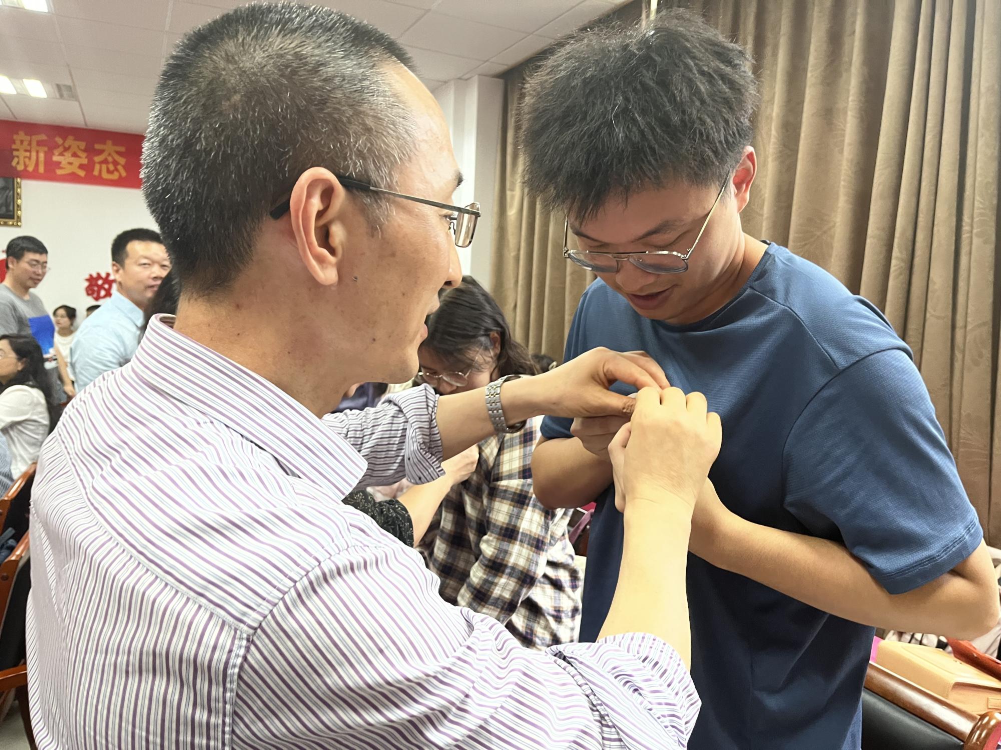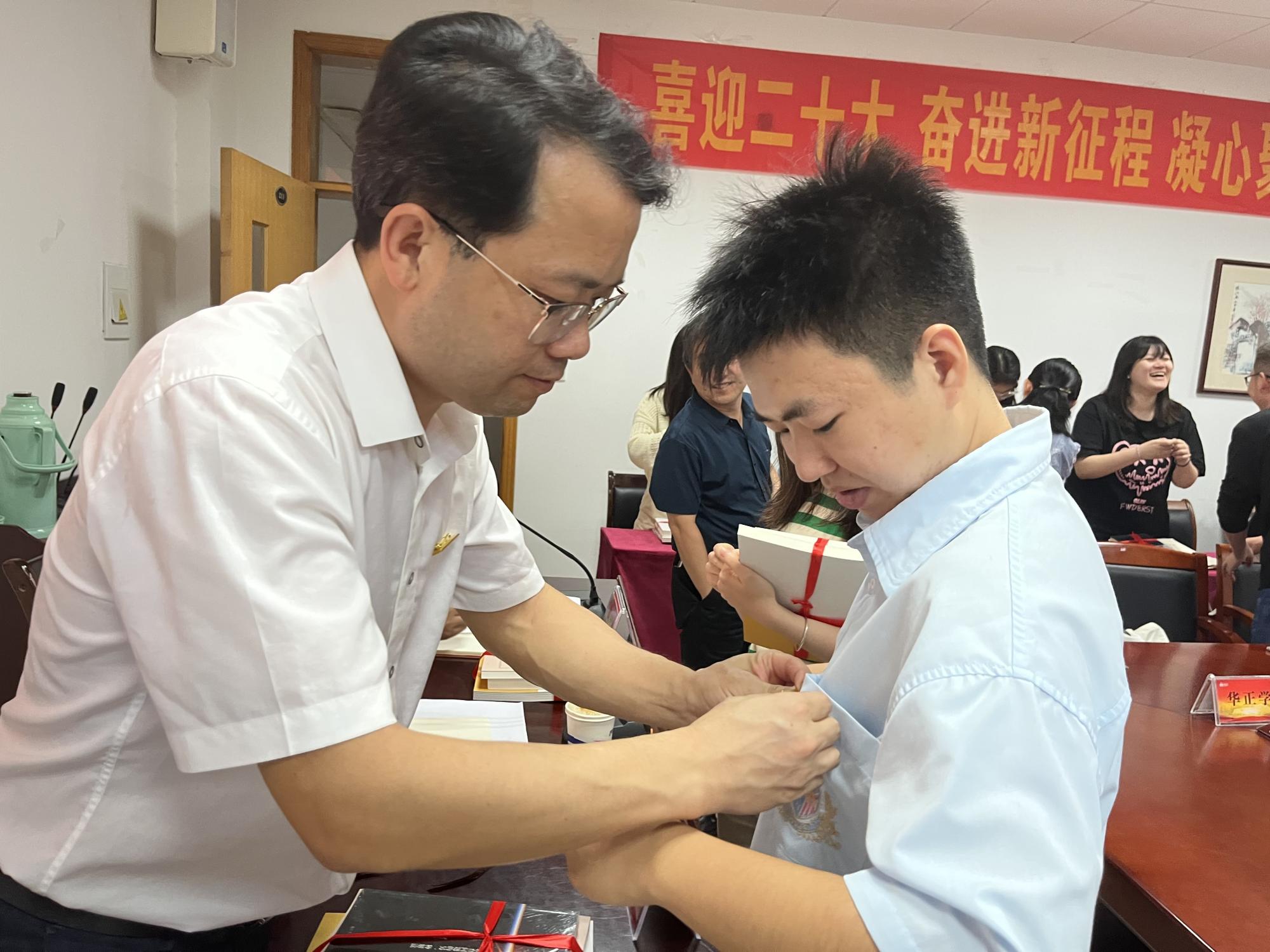 接下来,硕士生导师为2022级研究生新生赠送书籍并佩戴校徽。